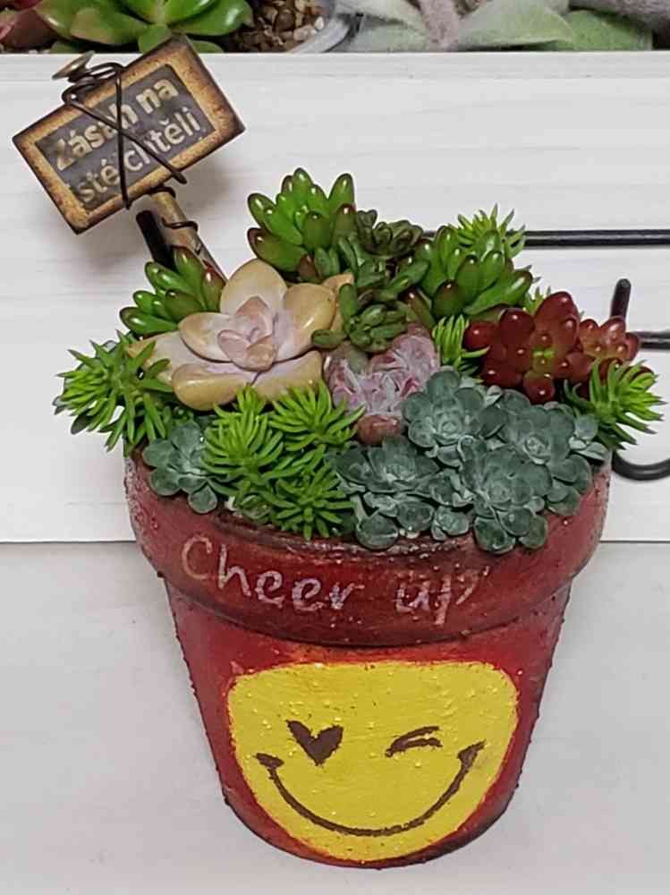昨日は雨模様の天気で、気分が⤵️でしたが、この鉢のチアアップの言葉と明るい色合いのかわいい絵で、元気が出てきましたよ。😄✊‼️