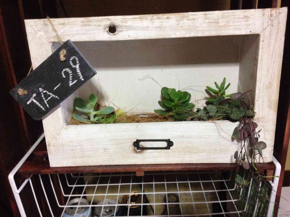シャビィなウッドフレームに多肉植物を植え込み、黒板プレートに好きな言葉を書込しました📝