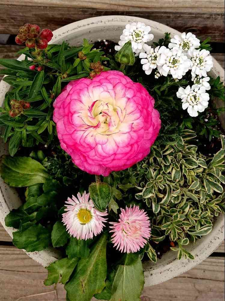 金魚草、イベリス・ブライダルブーケ、ラナンキュラス、シレネ・ユニフローラ、チロリアンデイジーを寄せ植えにしてみました🎶