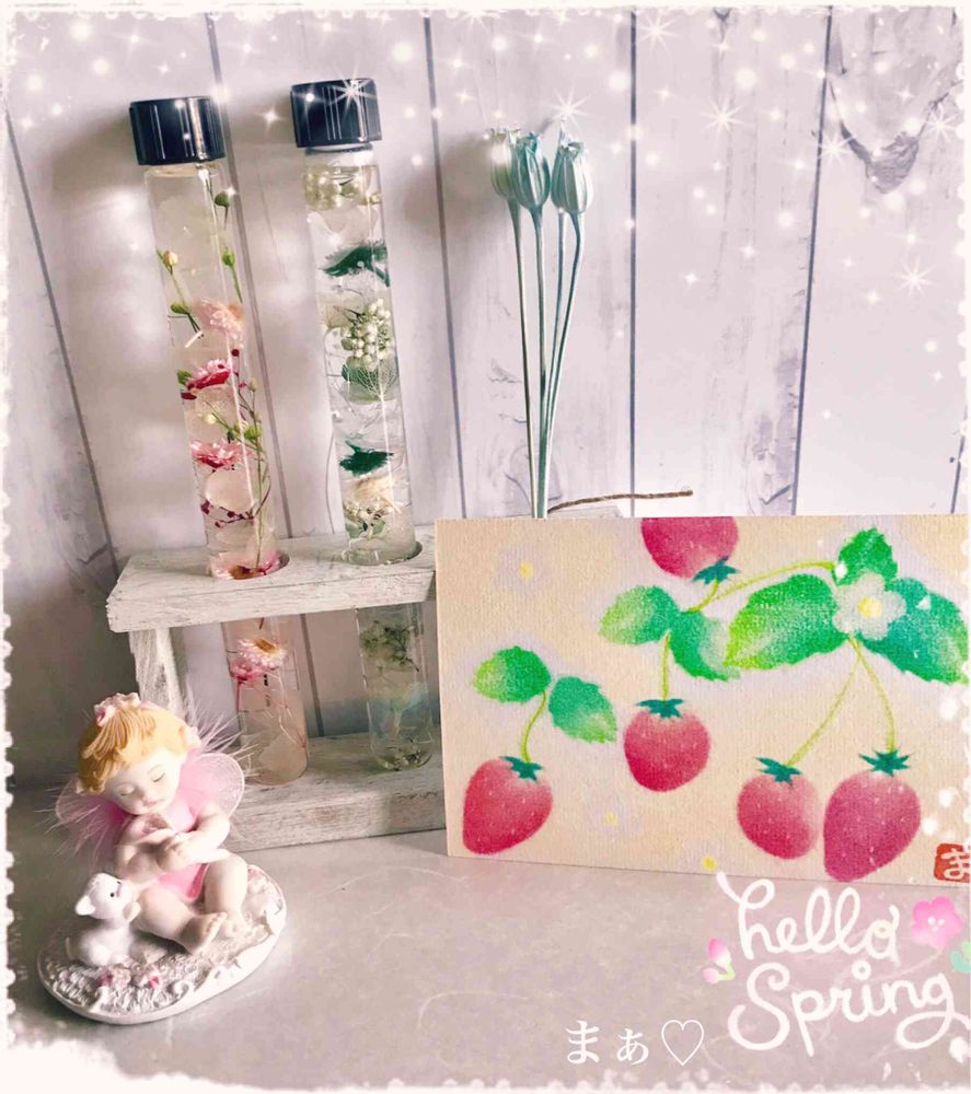 試験管ハーバリウムも綺麗にお花が順番に入ってるから可愛いいね〜💕赤い🍓もピンクの天使も可愛い〜゚+.(◕ฺ∀◕ฺ)゚+.