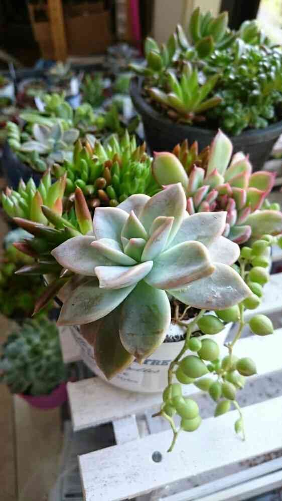この前、買ったモリモリツメレンゲと今日、いつものコアな園芸店でかった、名無しの多肉さんで寄せ植え。
