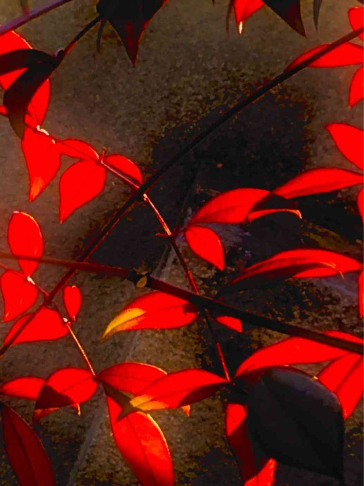 赤い実をつけるナンテンは葉っぱも真っ赤になります。