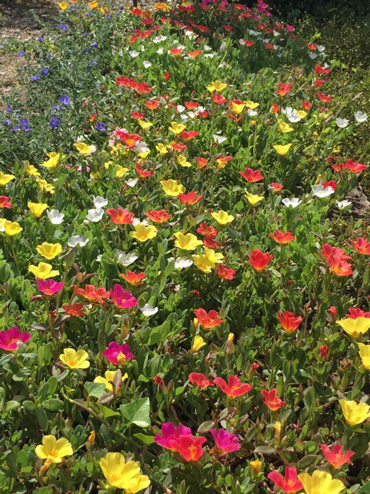 こんにちは〜😊花壇のポーチュラカとアメリカンブルーがいい感じでモリモリになりました。🌼