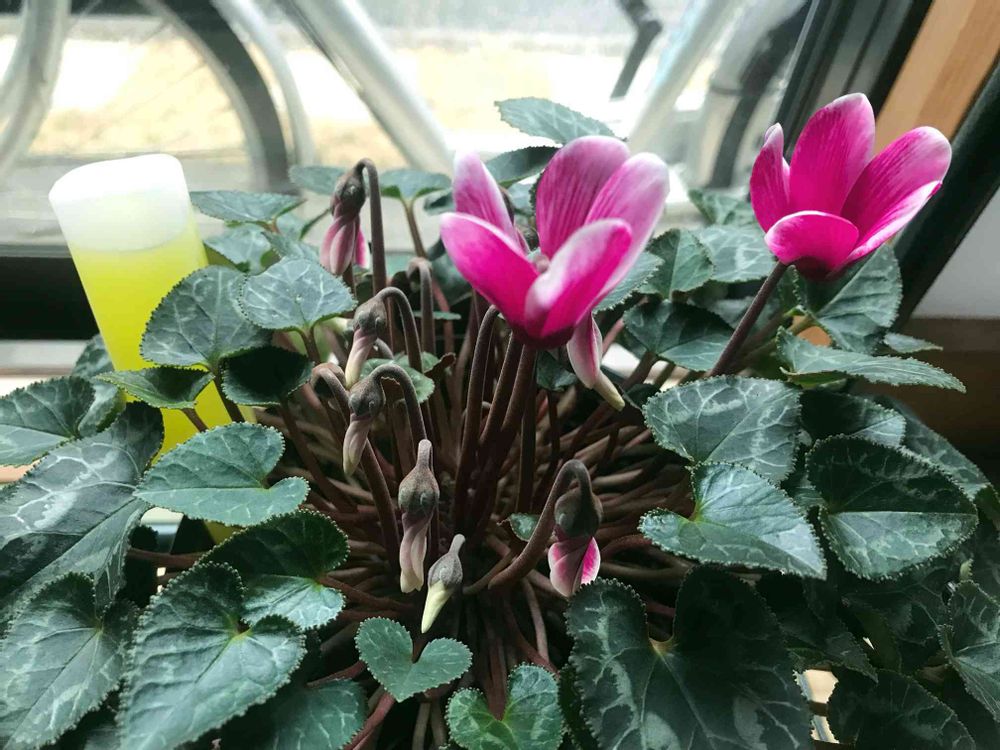 陽に当てすぎて多少ぐったりしてしまったようなシクラメン。花もだいぶ寂しくなってしまったが、次の花芽がぞろぞろ顔を出しているぞ。