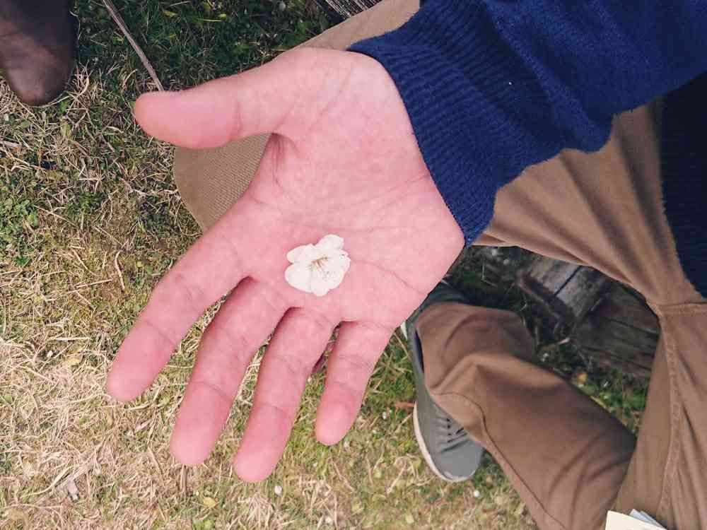 落ちていた梅一輪。こうやってみたらちっちゃいね。(旦那の手が大きいのか!?)