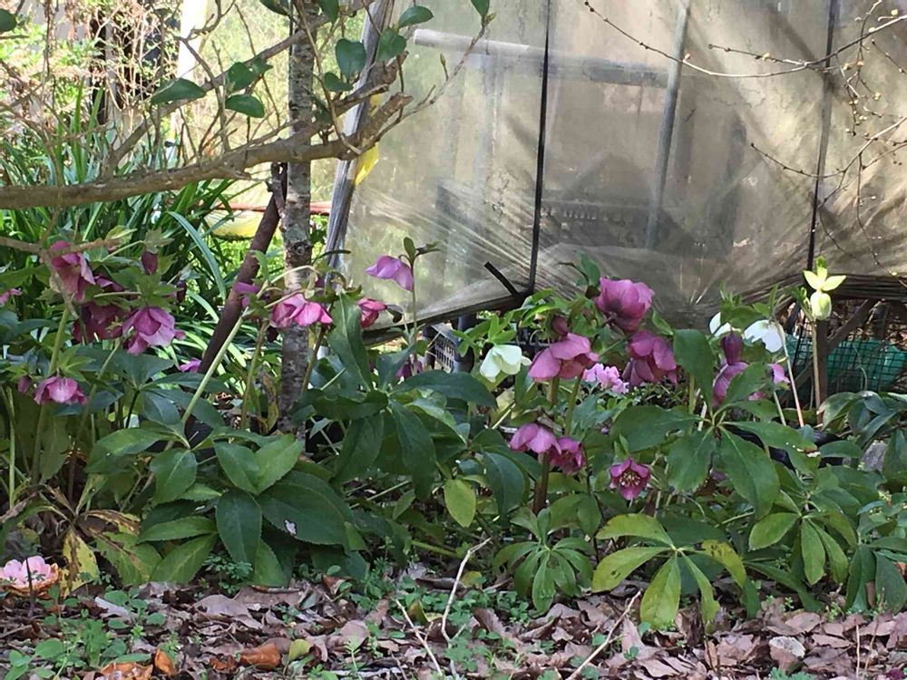 タンポポを発見した野菜畑(自宅の段下にある畑)から我が家の方を見てみたら、仲良く咲き揃ってきたクリスマスローズさん達が…🤗🌸。一年に一回の光景です👀✨