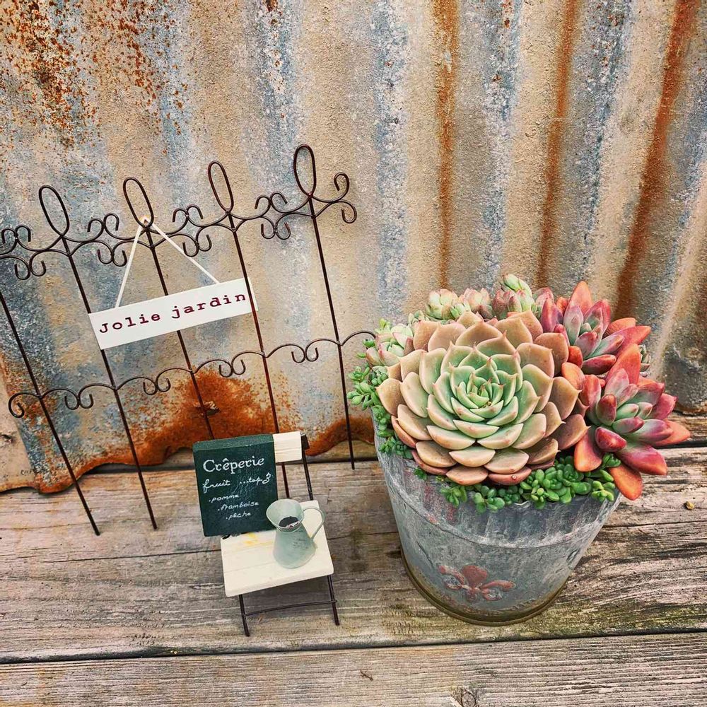 ブリキカップに寄せ植え。ピンク系多肉で可愛らしく❤