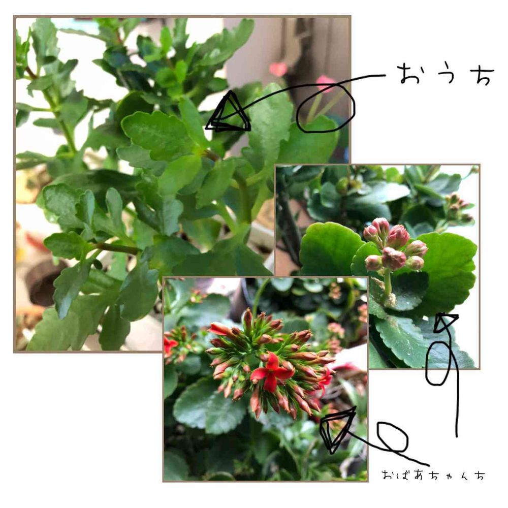 おばあちゃんちのカランコエ親株の蕾が色づいてきたのにおうちのカランコエは蕾も付いてないこと。