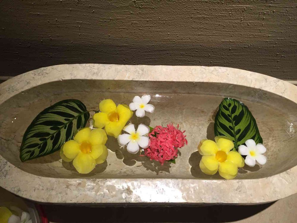 客室の水盤に庭から積んだ花と葉で装飾✨