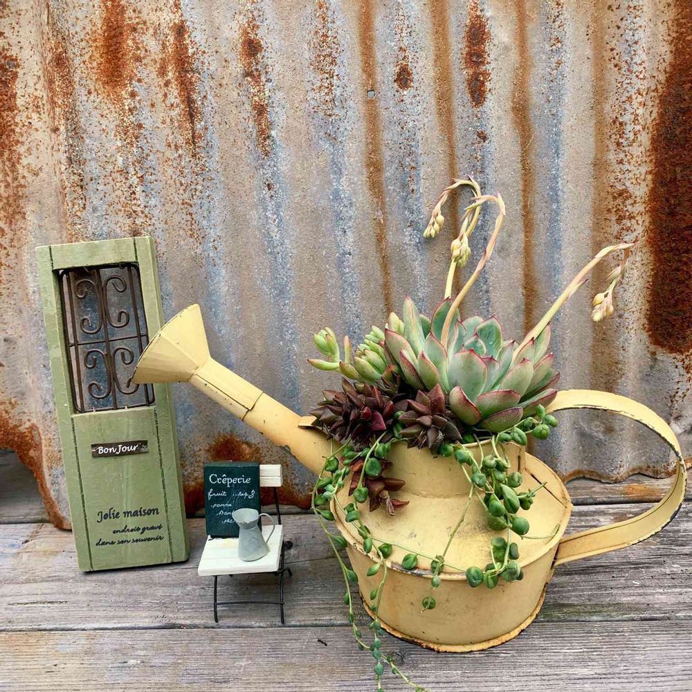 黄色いジョーロの寄せ植え。花芽がびゅんびゅん❗️