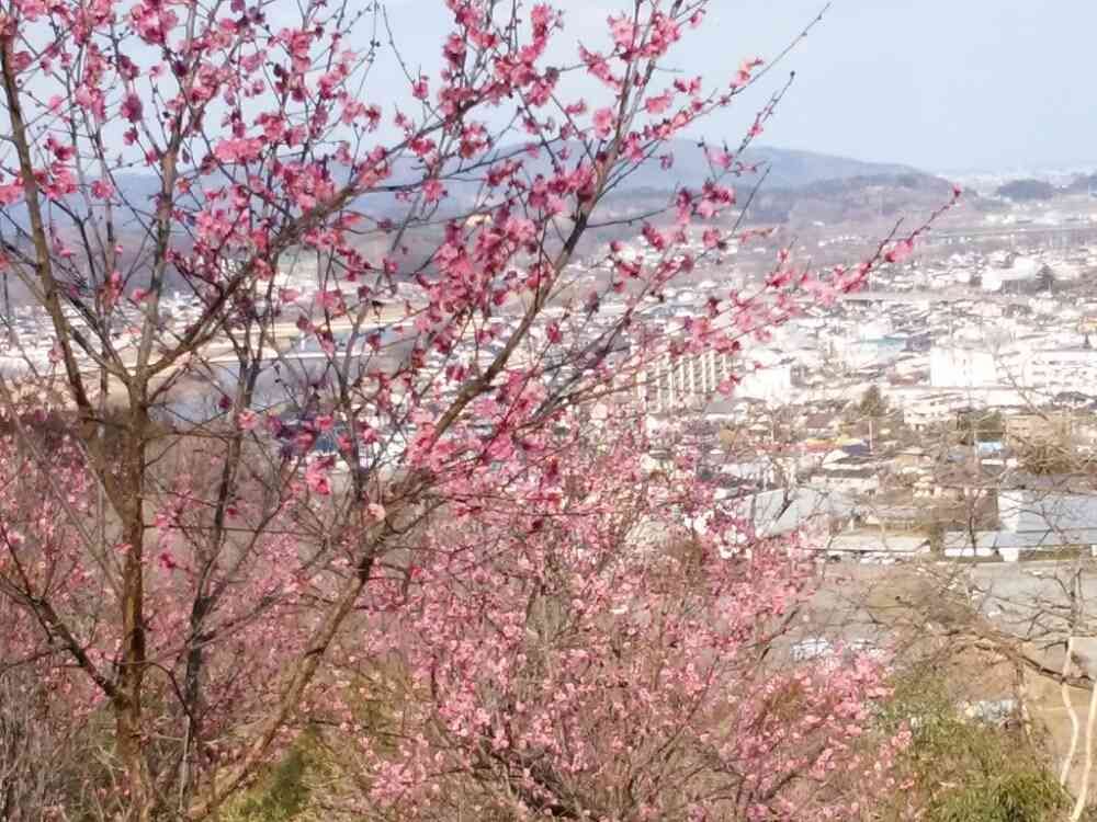 紅梅越しに町を望む。この時点でもう息があがってる💦