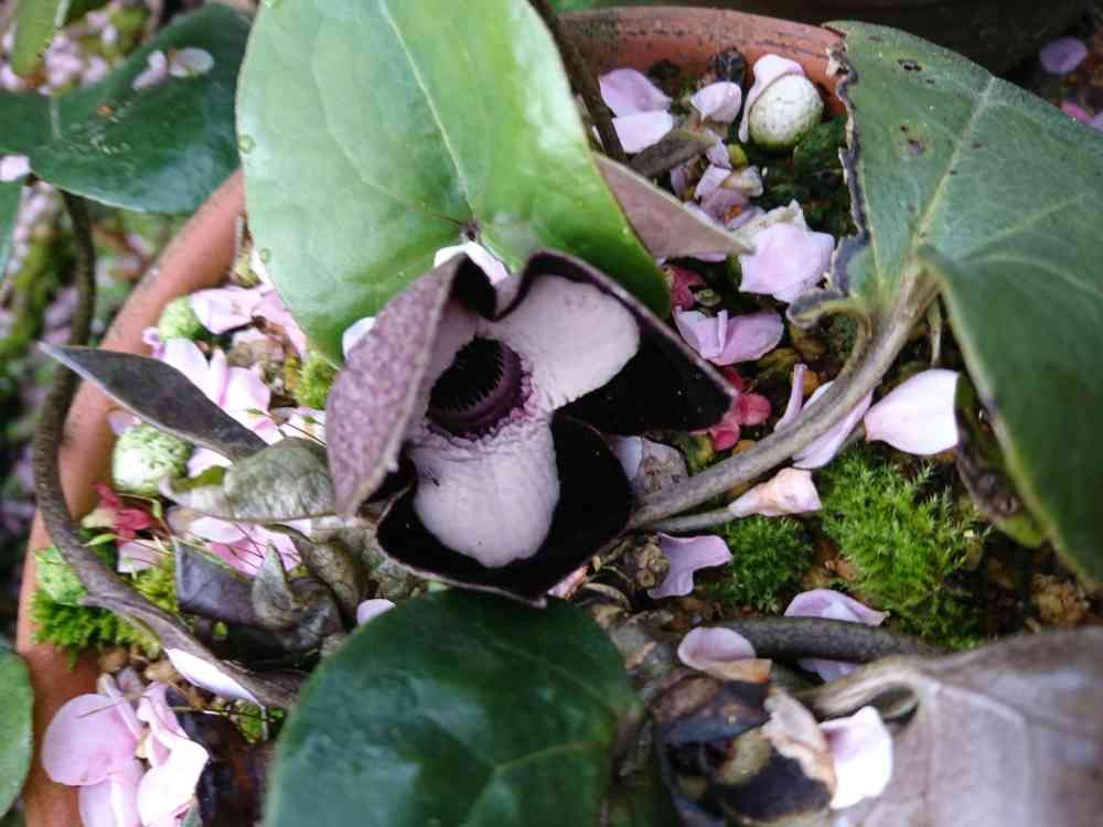 枝下梅の下…寒葵の花が咲きました、回りに枝下梅の花びらが落ちています…。