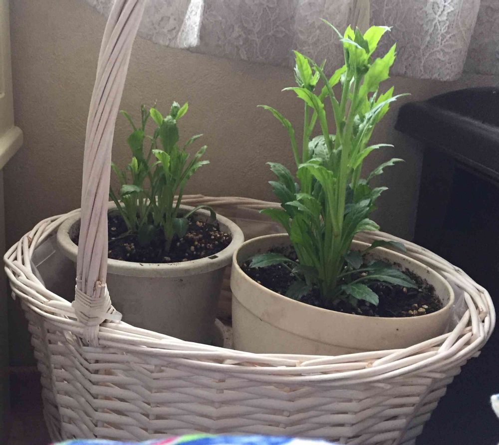 日の当たる方を向くので、カゴを回していますが、背が高い方が紫かな。