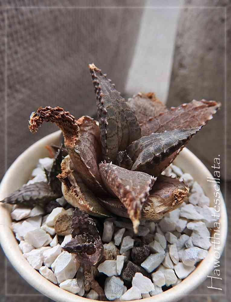 ハオルチアの竜鱗(テッセラータ)。葉は半分枯れてるし、お世辞にもきれいに育っているとは言えない株だけど、なぜかこの雰囲気もいいなと思ってしまう。素焼き系の渋い鉢に植えたらもっと雰囲気が出そうなんだけど、ハオルチアと素焼き鉢はあまり相性が良くないんだよなー。