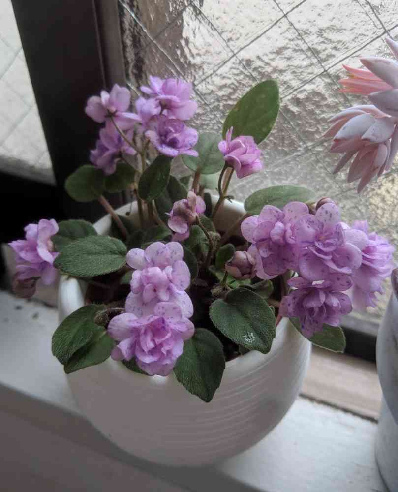 いつもはテーブルに置いているセントポーリア。今日は薄暗いので窓辺で撮影しました。元気に咲いてくれています(●︎´▽︎`●︎)