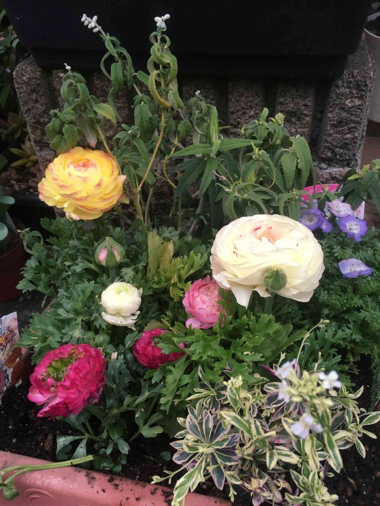 ラナンキュラス、斑入りアラビス、ネモフィラ、ピンクアメジストセージです😊