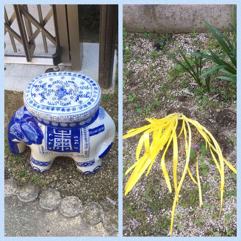 タイ🇹🇭から持ち帰られ、東京の極狭玄関の横に長年置かれ、挙句新しいすみかまで連れてこられた 超お安いゾウさん。しばらくぶりに動かしたら、下から ウドと化した (多分)水仙が出現しました。ごめんねー!