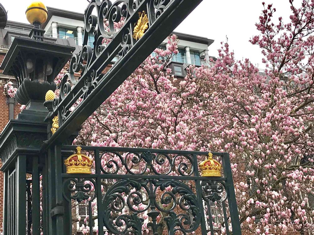 はい、黒い門と赤い冠にモクレンの薄いピンクが絶妙のハーモニーでした❤️