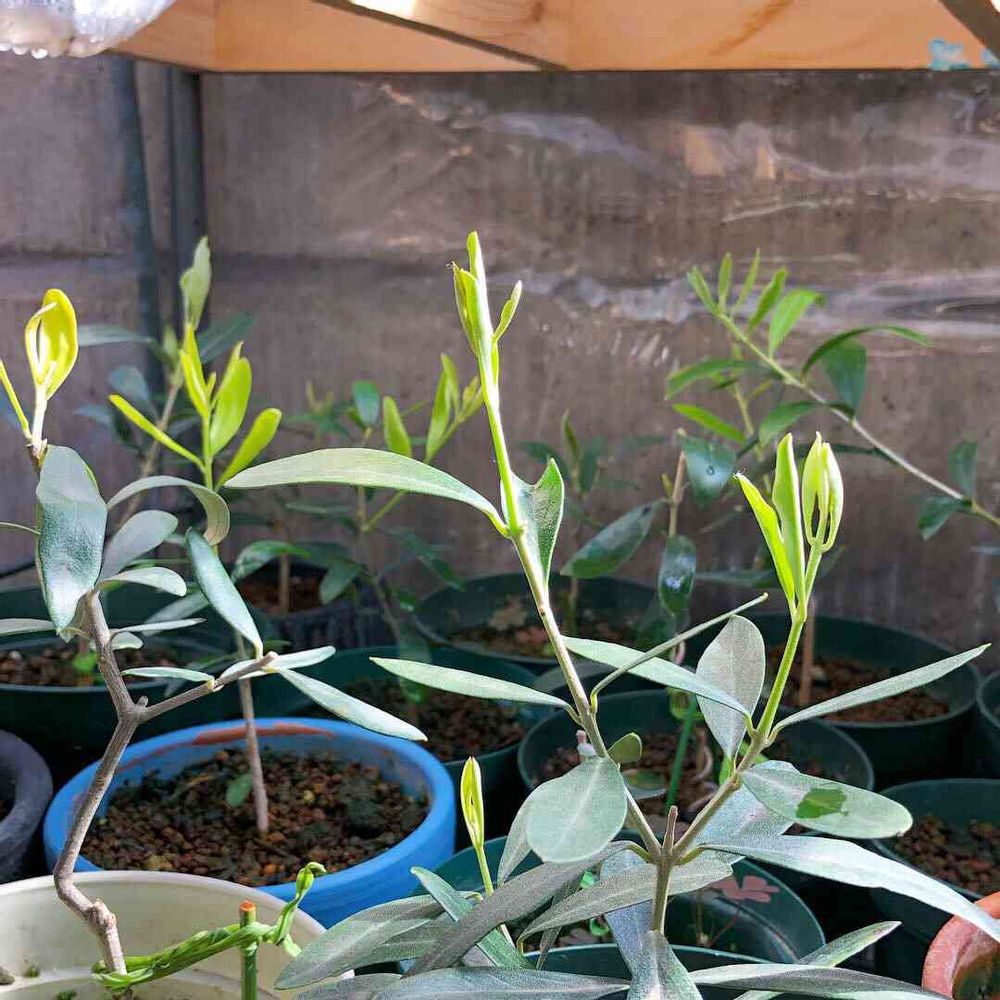 ビニールハウスの挿し木オリーブツリーには、綺麗な新葉が出ています。