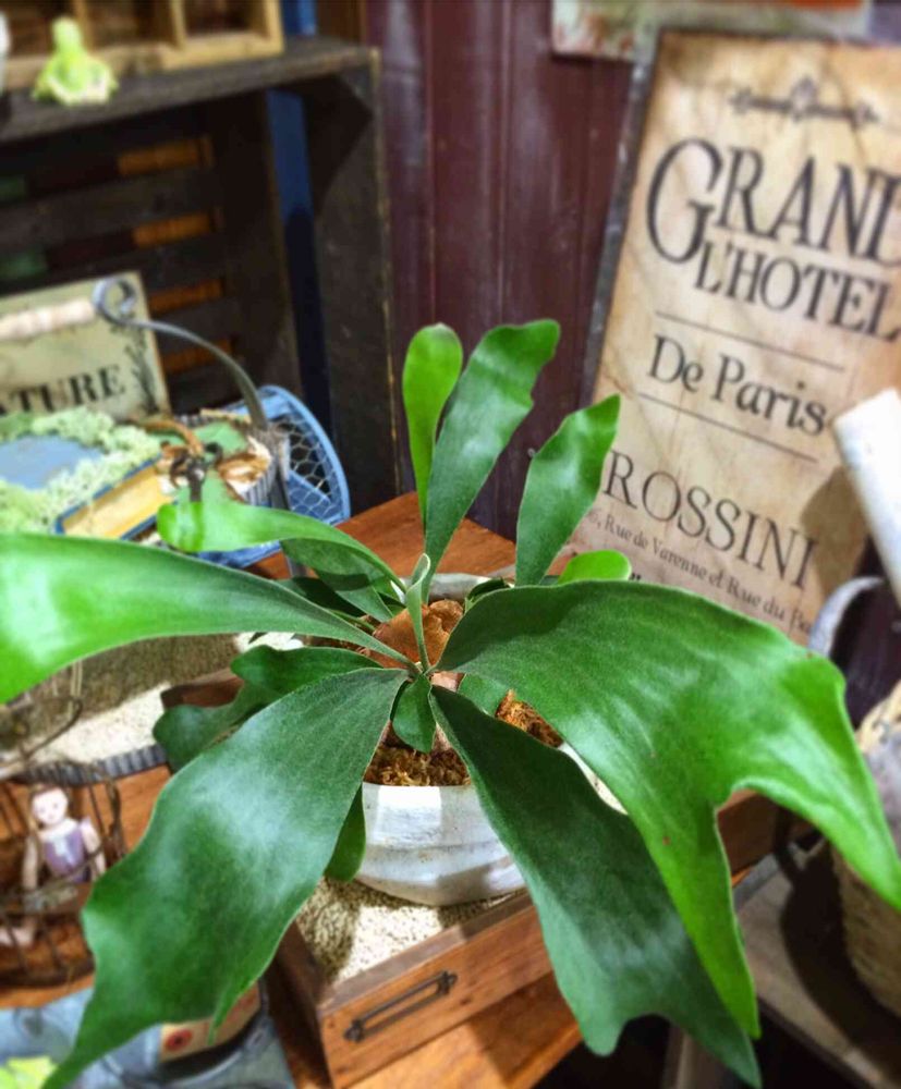 浅い陶器鉢にコウモリラン。