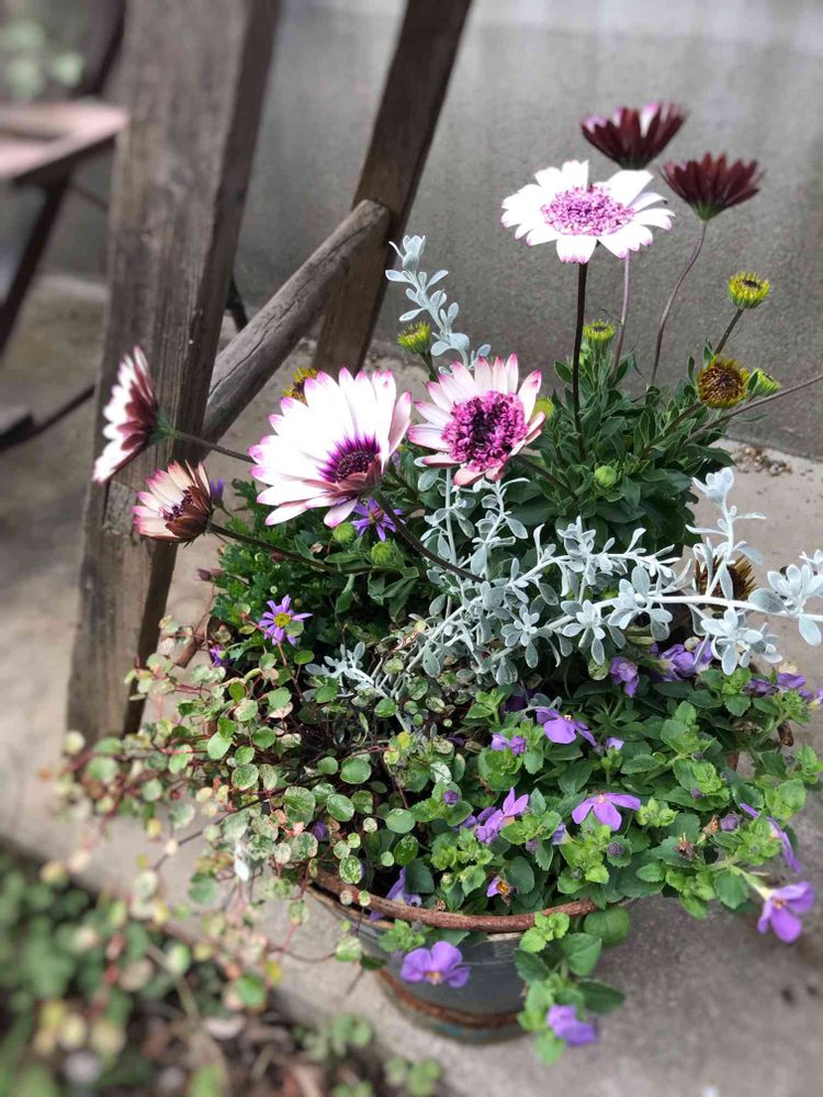 サビサビの青いバケツに寄せ植え
