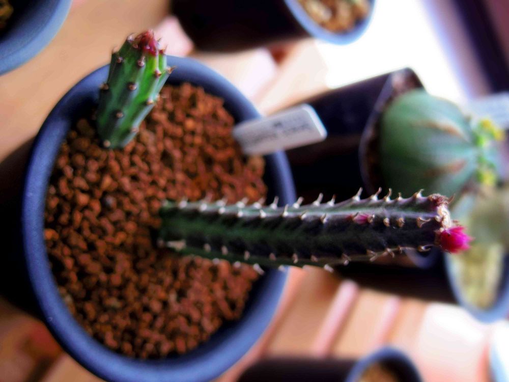 植え込みのバランス故なのか、ガサツさからか(笑)、洗濯物など引っ掛かったり、何だかかんだで、3回程ぶちまけている。いじけたのか、少し捻れ成長中。子株らしきものと、少し型が違うものも出てきた。写真の上の方のは子株、今はどす黒い色に変わってます。他のところから花目かな?と思う様な兆しあり。