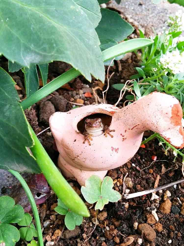素焼きのピックなので、中はヒンヤリ。雨も抜けるので安心です🐸