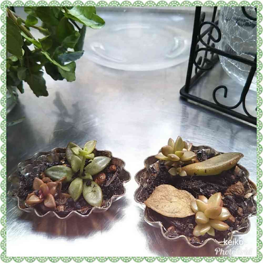 葉挿しした子をいつものアンティークのマドレーヌ型に移しました。