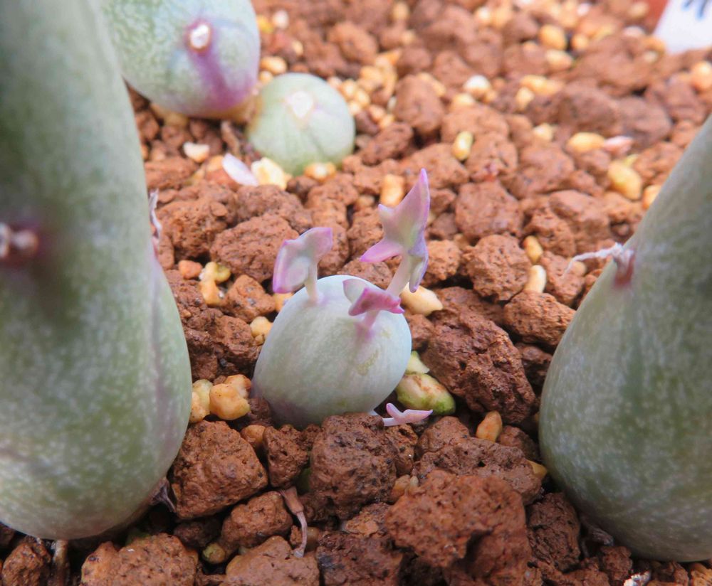 いつのまにか七宝樹の子株が。小さな葉が赤ちゃんの手に見える。