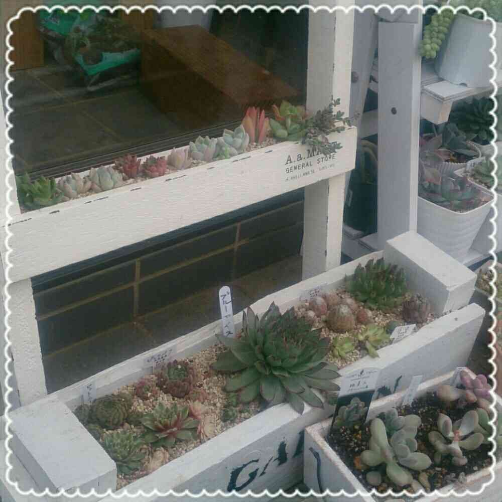 大きな大きな木製プランターに、センペルの寄せ植えをしてます。