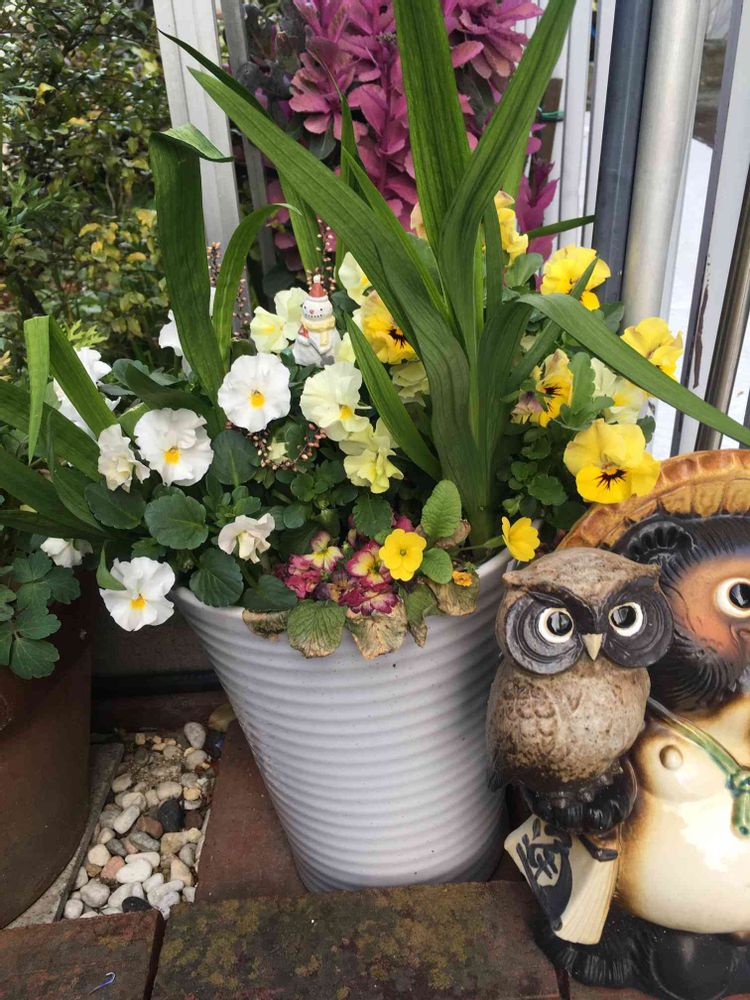 おはよう😃ビオラ、ジュリアンの寄せ植えからフリージア伸びてます💖今日も一日頑張ろう👍