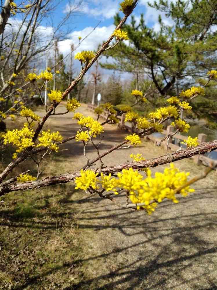 いつもの散歩道 サンシュユが満開になっていました☺️