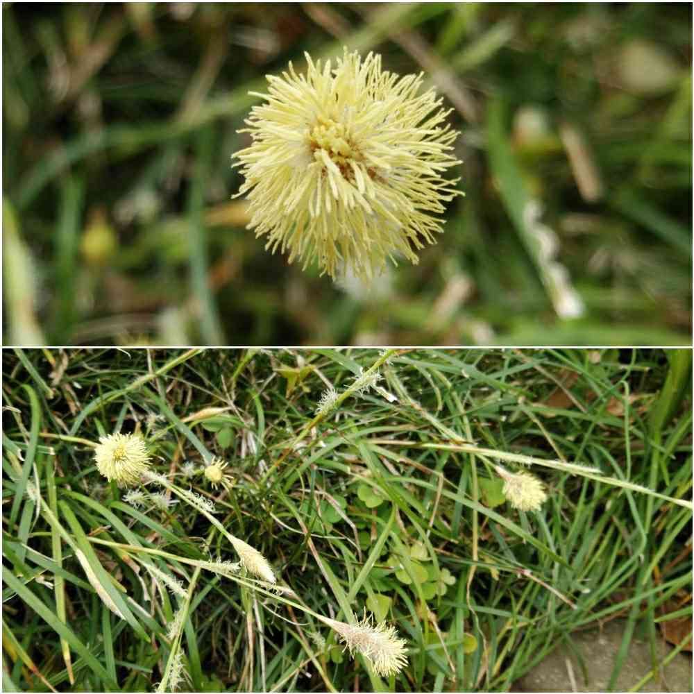 2㎝くらいの薄黄色の丸いホワホワ、少し触れただけで黄色い花粉?粉が沢山舞います