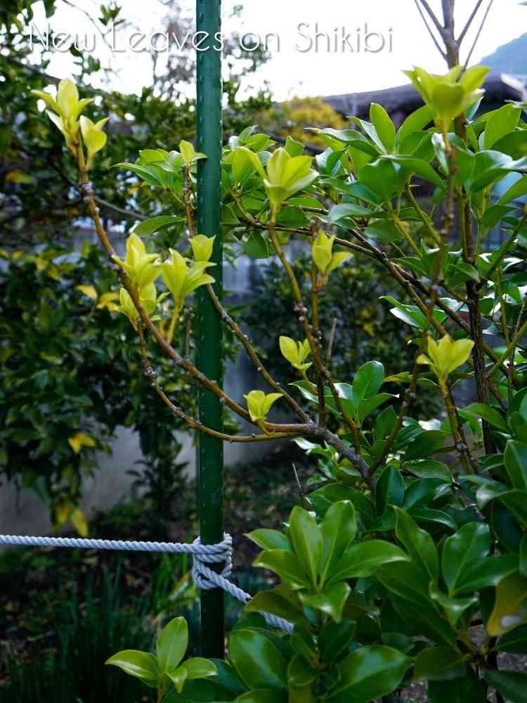母屋西の畑のシキビに綺麗な新緑の葉がついた(台風ガードがついたまま😣)。🌱🌿💫🌞👍