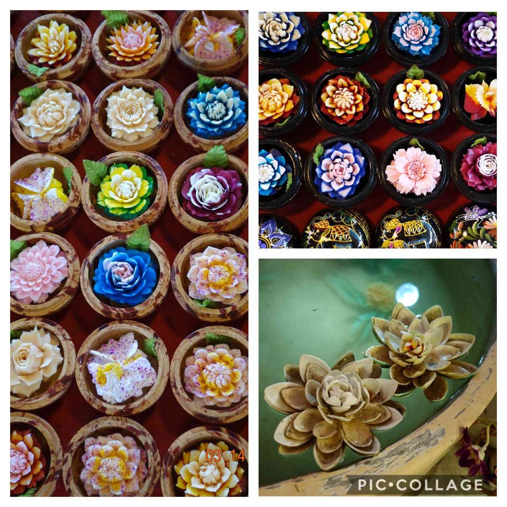 左⬅️と右上↗️はパタヤの水上市場で売ってる石鹸で彫った花のお土産です🌼