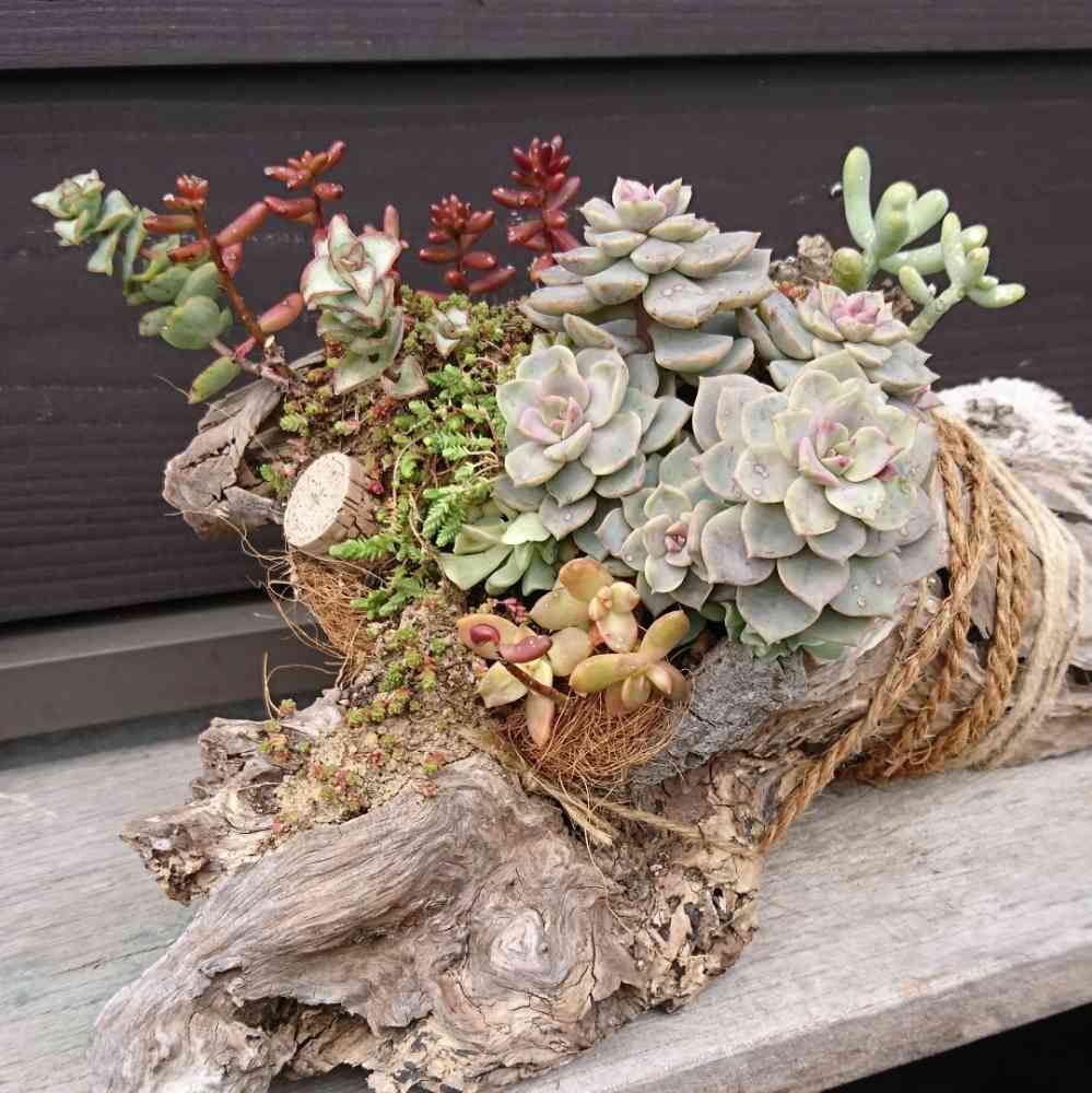 底に苗ポットや椰子の繊維を仕込んで土を入れ、多肉植物を植えました。