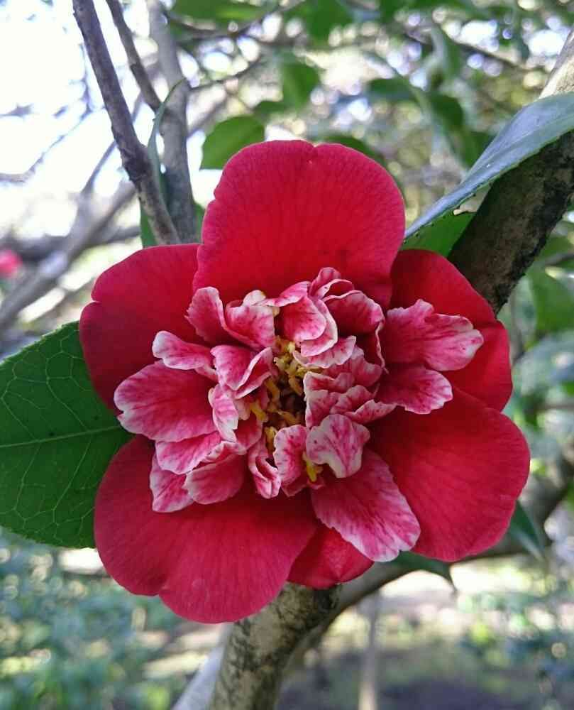 紅白混じりの花芯が素敵な唐子咲きの椿です💕