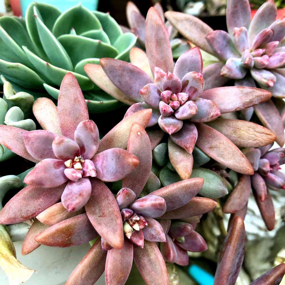 初めまして。うちもお外でそのまま放置してたら、こんな紫のなかにオレンジの芽が少し出てきた感じです。場所によって色が紫だったりピンクだったり😆紅葉かな?たぶん、だんだん薄れていくと思います❤️