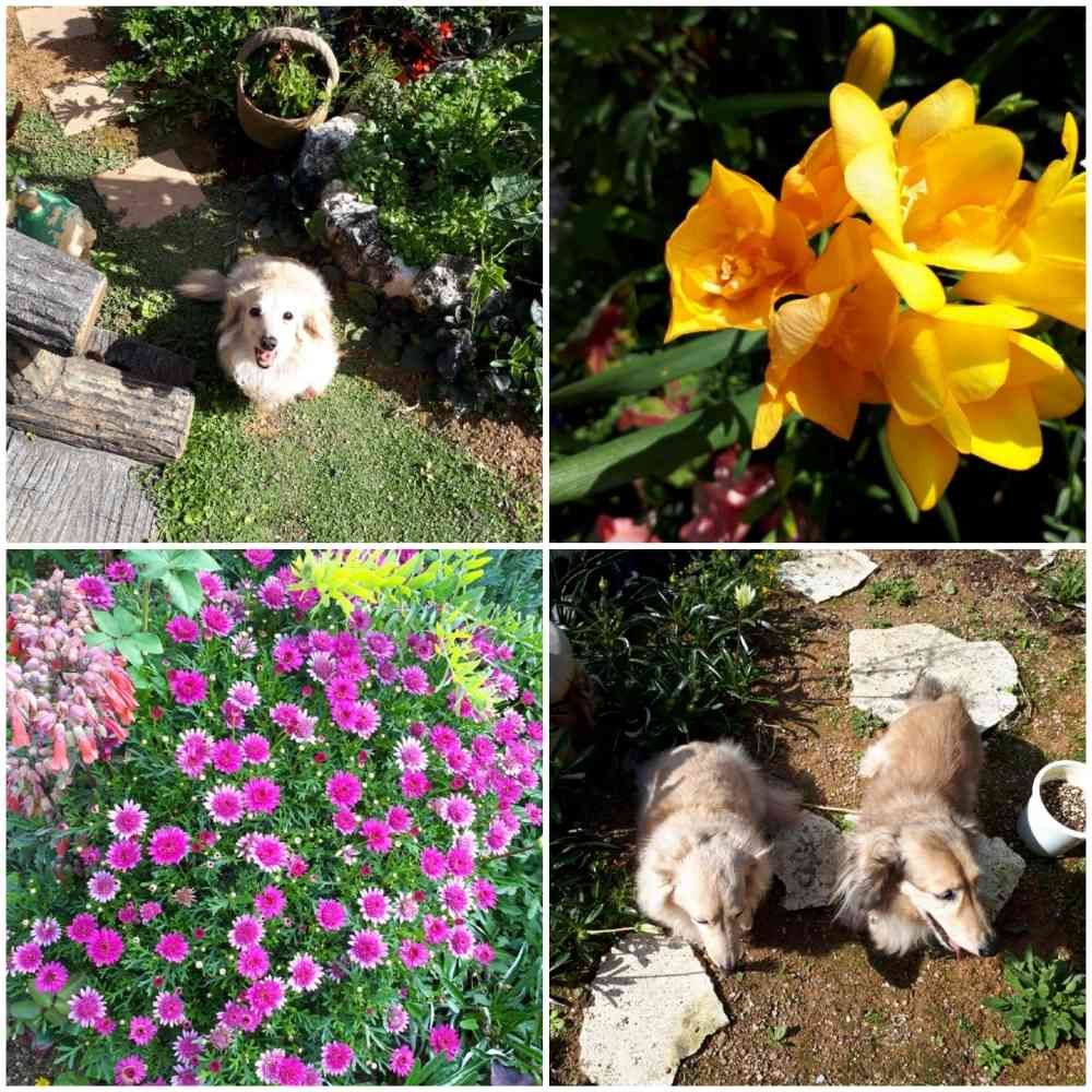 お庭でお昼寝にお花クンクンが大好きんですね