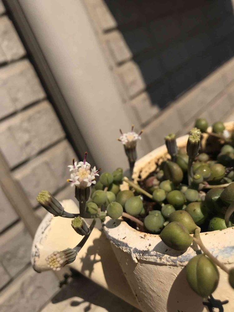 多肉植物のグリーンネックレス、本当に大好きで数年越しに何度も挑戦しては1週間で腐らせたり枯らしたりしてて、これが4度目の挑戦だったんだけど、お花が咲くとは!!嬉しすぎるー!!!