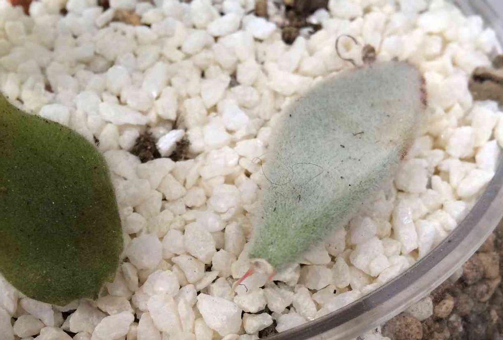 落ちた月兎耳の葉を放置していたら…ピンクの根がにょきにょき(• Θ •)触角つきました(• Θ •)笑