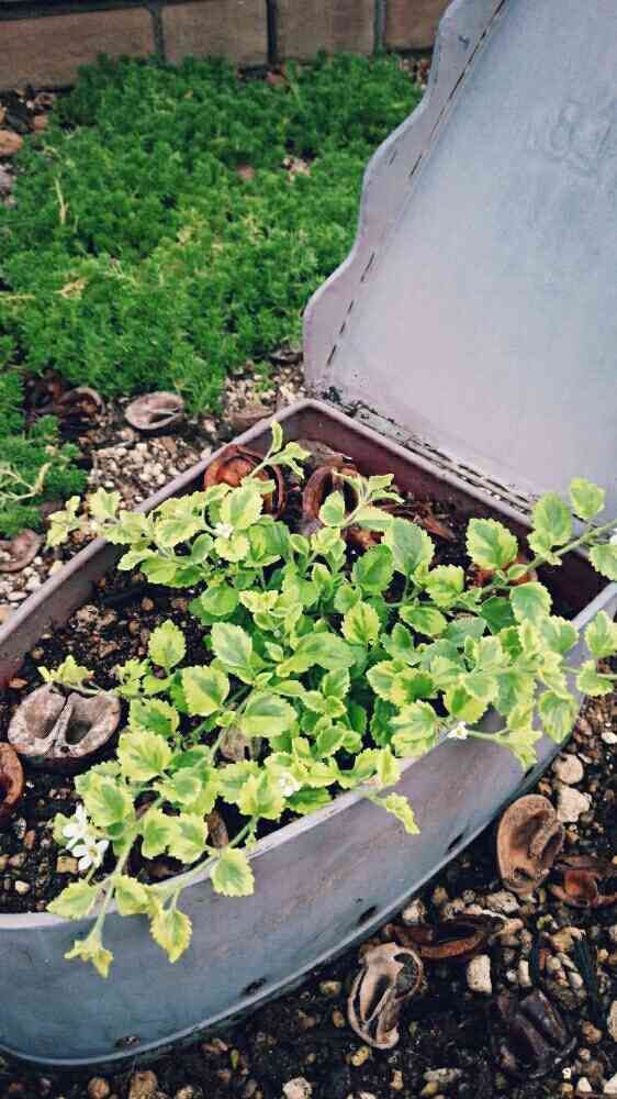 地植えにすると延々と広がってしまいそうなので、アイロン型のプランターに植えて花壇へ(*^-^*)