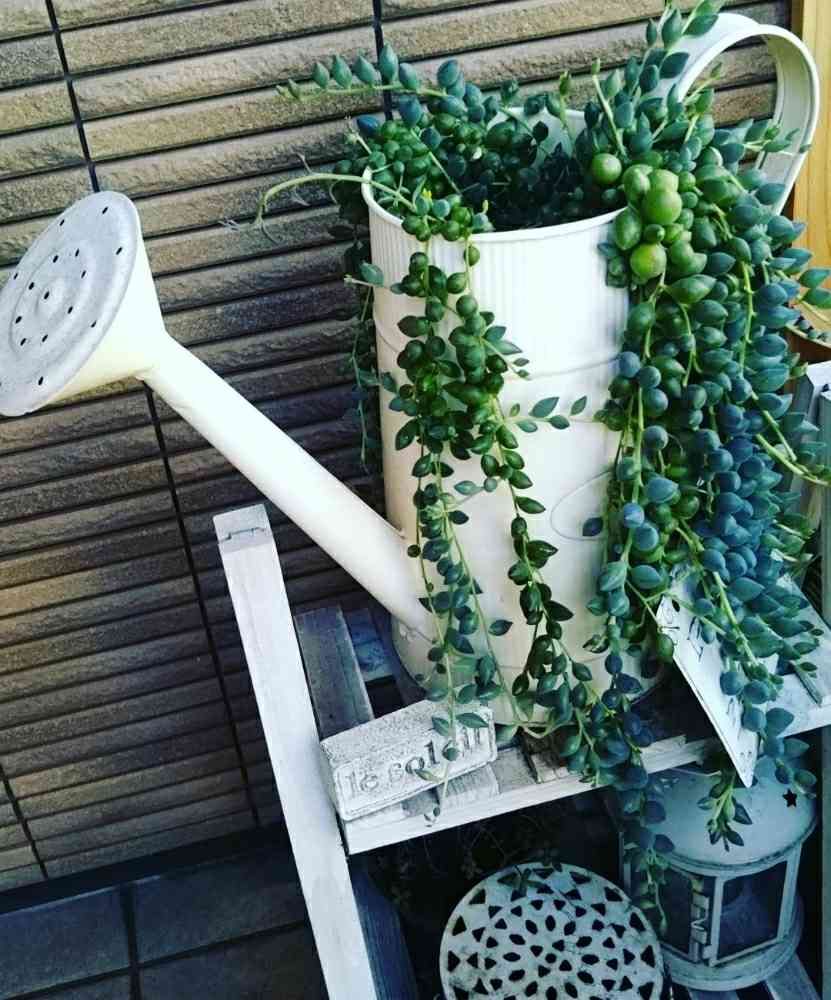 ブリキ製のジョウロの底に穴をあけてピーチネックレスを植えたのですが、伸びすぎて凄いことになってる😂