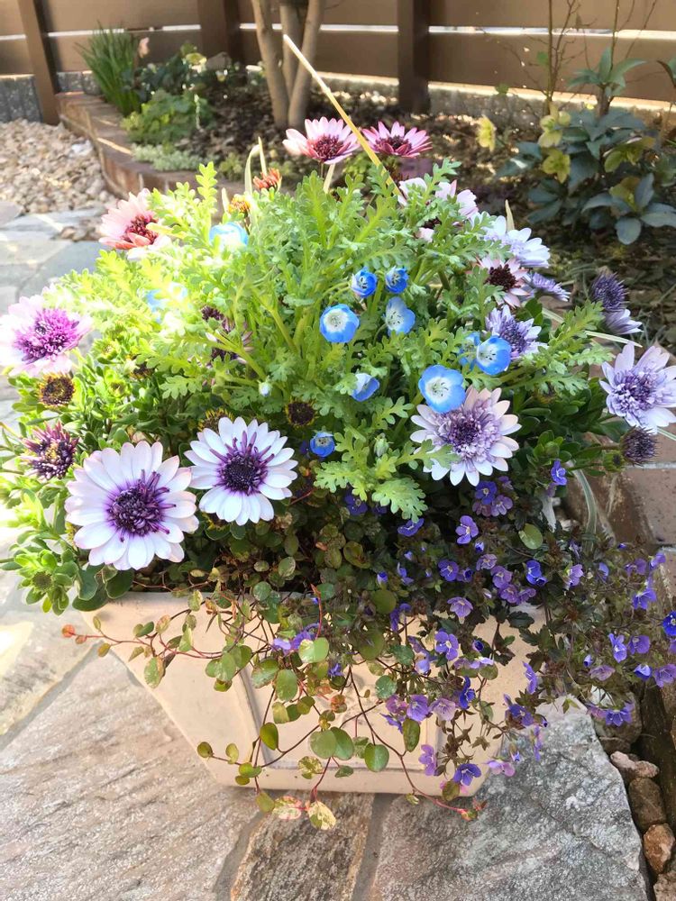 私も花壇の他にやっぱりオステマさんと寄せ植えしてますよ😆👍うちのオステマさんはオレンジ系かな💛💙