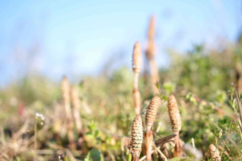 つくしは、シダの一種であるスギナが春先に出す生殖用の茎(生殖茎/胞子茎)で浅い地下茎でつながっています。