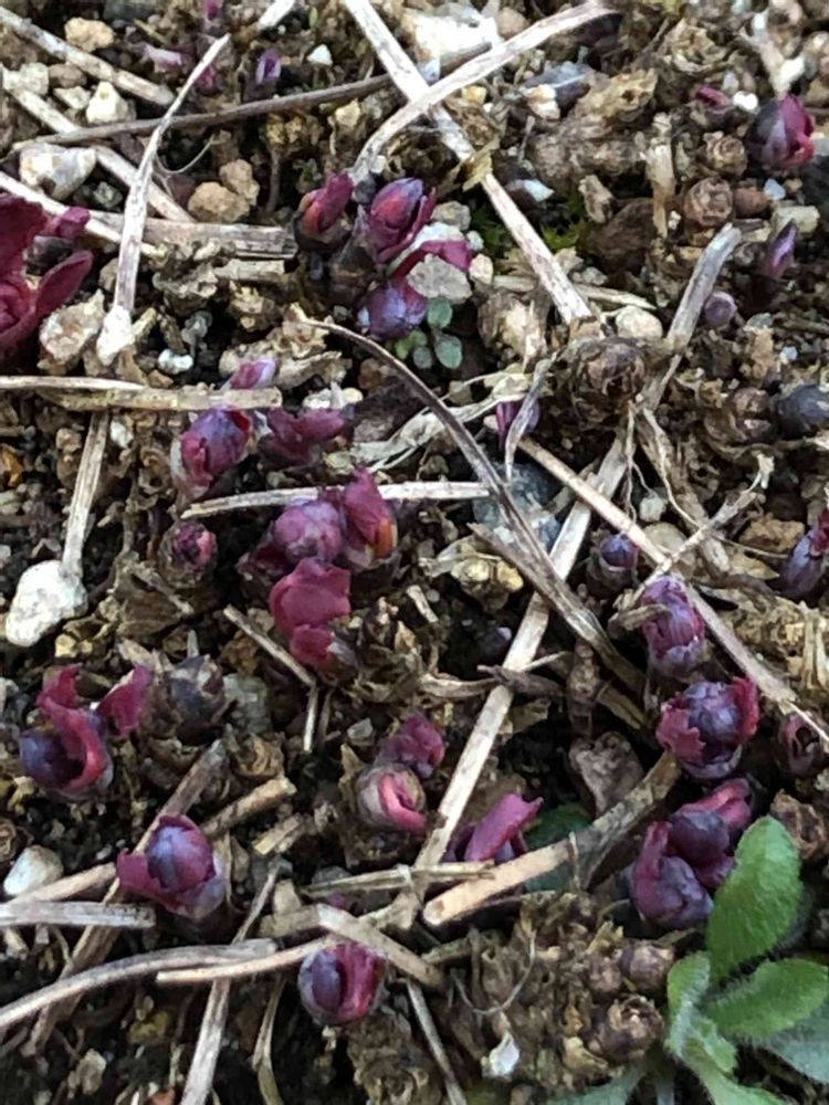 赤紫色の🌱🌱🌱に青い花~去年 覚えたタツタソウ💙山野草の可憐な姿をお見せ出来るのを、お待ち下さい(≧▽≦)