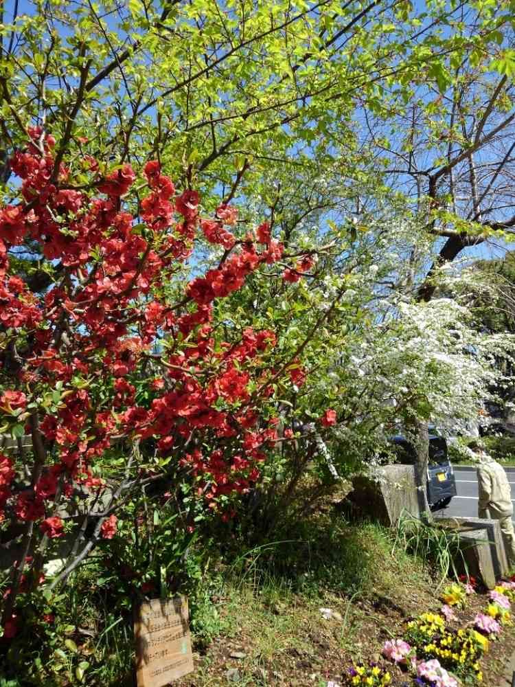 散歩してます、あまりにもお見事な赤色ぼけ、でした!隣は 雪やなぎ、後ろには河津桜もう葉っぱだけでした、残念😫モンチッチさんありがとーございましました🤗