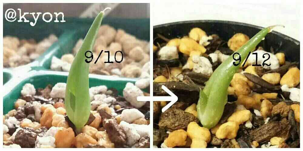 ピクミンみたいな形の最初の葉は、本葉の展開を邪魔しないようにか、後ろに反ってきたよ。