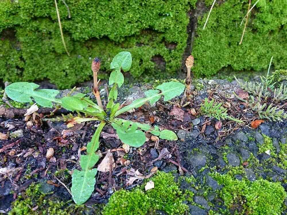 古くなったアスファルトの隙間から、ツクシとタンポポか生えています。