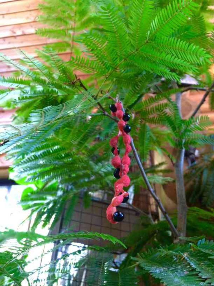 少し前の投稿で、枝豆の様だったエバーフレッシュの殻が赤くなり、はぜて種が7つ付いています。よくやった、エバーさん〜〜